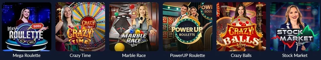 - Game Show játékok: Monopoly Live, Crazy Time, Mega Wheel