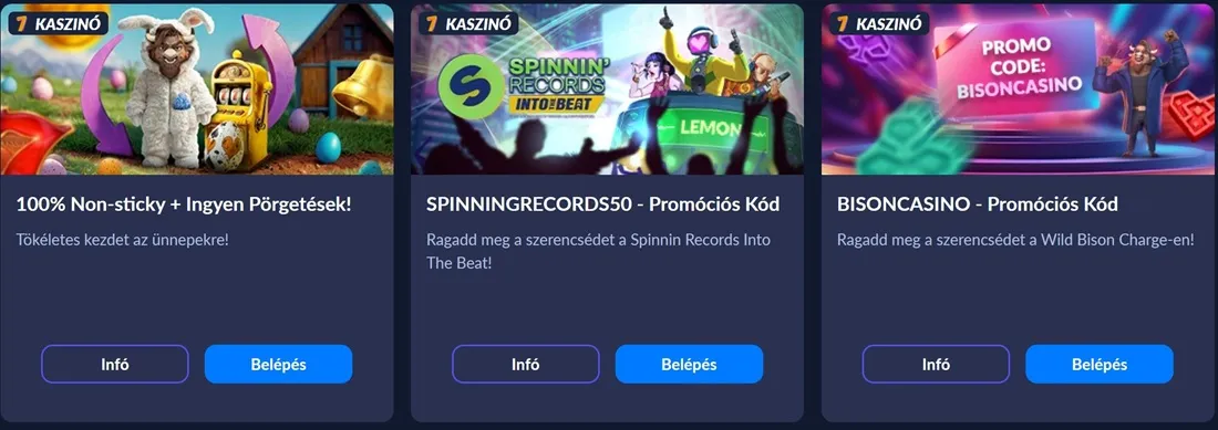Az új játékosok 100%-os bónuszt kapnak első befizetésükre, amelyet akár ingyen pörgetésekkel is kombinálhatnak. Ez a kezdő csomag kiváló lehetőség arra, hogy felfedezd a kaszinót és a legnépszerűbb játékokat kockázat nélkül.
